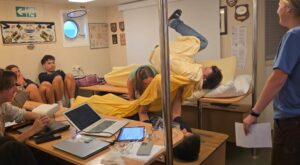 The rest of the day was filled with students doing workouts in the dungeon, studying, reading on deck or playing card games in the mess. Students are participating in extra sailing lessons with Claire, who knows everything there is to know about the ship. In order to obtain their Ordinary Seamanship (OS) certificate. We are all begging for a swim call but the current is too fast for now. Emma’s English class are working on making their own reconstructed fairy tales. Using original fairy tales from our childhoods. Even though we come from all around the world we all know what Little Red Riding Hood is but to ensure this Emma had the amazing idea of allowing students to perform and act out these fairy tales to the class. The funniest one being The princess and the pea performed by Emerick, Max, Ezra, Nezi and Zoe. Anyway, today was another good day. Life is what you make of it.