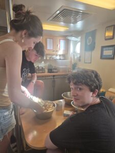 Today was full of excitement, as students gathered for their first Watches of Semester 2 (and for our nine newcomers, their first Watches ever!) Students are beginning to settle in, the rooms are mostly unpacked, and the red seabags are being stowed away after some very long journeys. After dinner, students gathered to complete their cabin agreements, a very important step for creating a comfy and cozy living situation for all. Afterwards, students enjoyed cookies fresh from the oven, lovingly prepared by our Semester 2 students and faculty team. They played board games and enjoyed time to socialize and catch up in the Mess. Up on Watch, Rolland shared his knowledge of the night sky with his new Watch mates. It was a beautiful clear night; Jupiter was shining so brightly you could almost reach out and touch it!